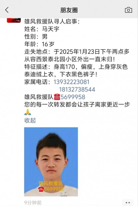 雄风救援队寻人启事:姓名:马天宇性别:男年龄:16 岁走失地点:于2025年1...